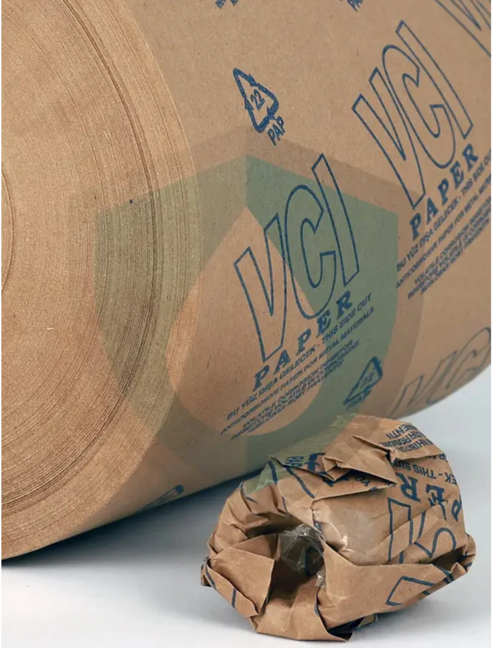 VCI Kraft Paper. High-strength, durable kraft paper impregnated with vapor corrosion inhibitors. It is ideal for wrapping and interleaving applications, providing reliable protection for steel, iron, aluminum, copper, and other metal parts during storage and transport.