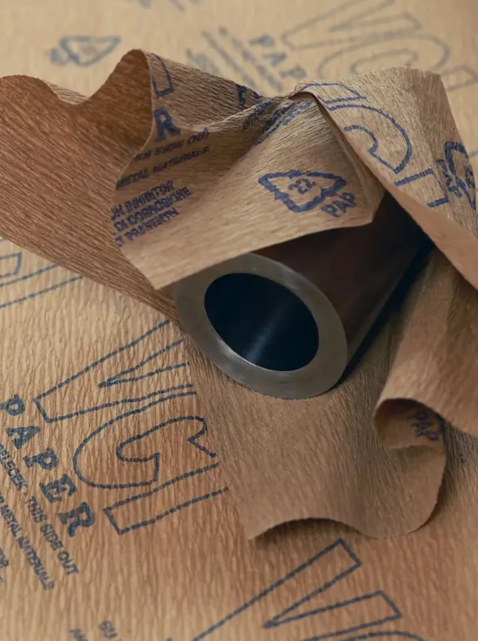 VCI Crepe Paper. A flexible, textured VCI paper offering superior conformability. It is excellent for wrapping metal parts with complex shapes or uneven surfaces, ensuring full coverage and corrosion protection without the need for tape or additional fasteners.