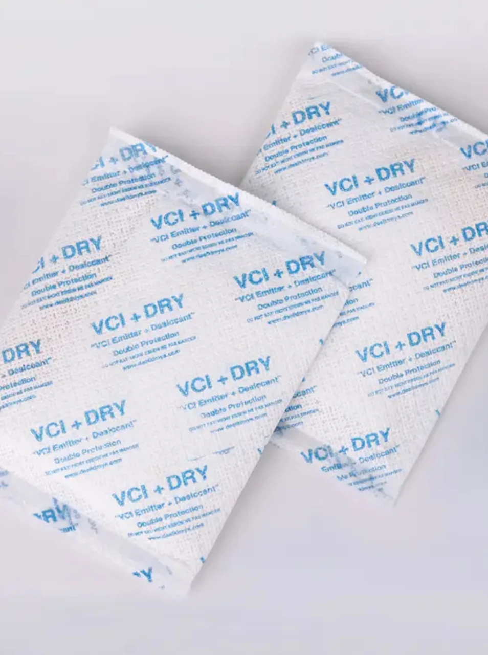 VCI+DRY. A dual-action solution combining desiccant properties with advanced VCI technology. This product absorbs ambient moisture while simultaneously emitting corrosion-inhibiting vapors, ensuring enhanced protection for sensitive metal parts exposed to fluctuating humidity conditions.